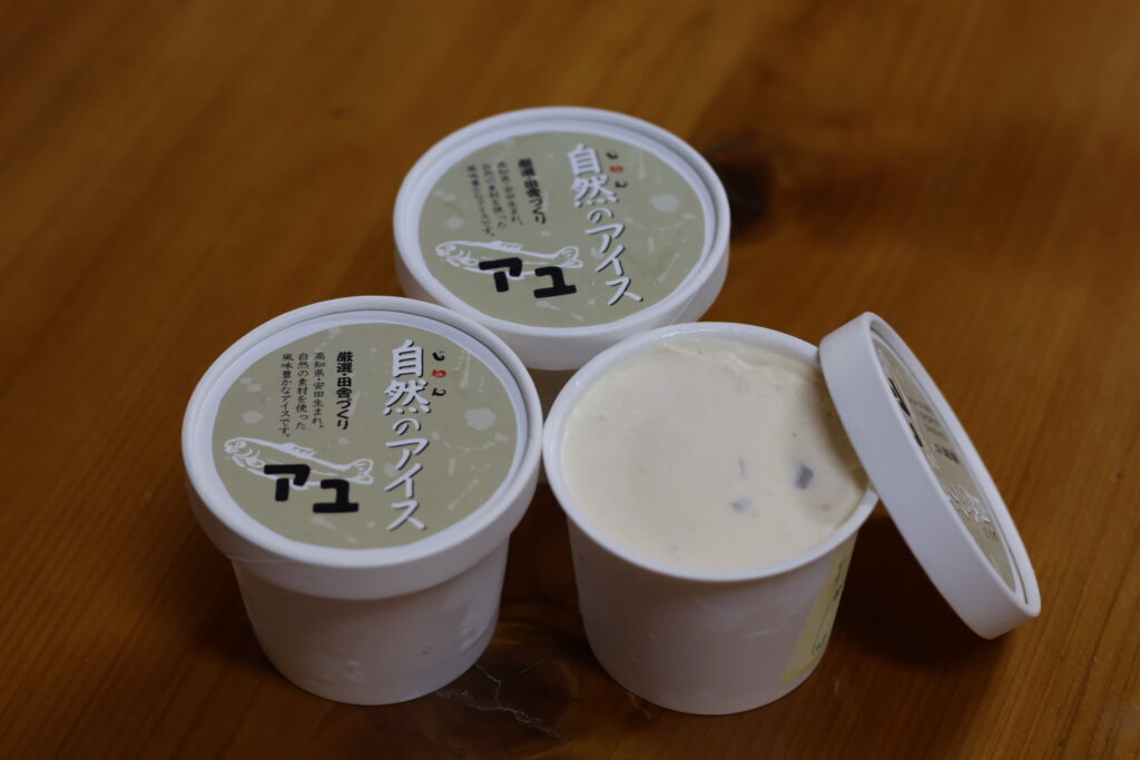 安田川で育った天然鮎の身を混ぜ込んだアイスで、甘みの中に鮎独特の風味や香ばしさやを感じれる、最高の一品やきね~1回食べてみてよ!