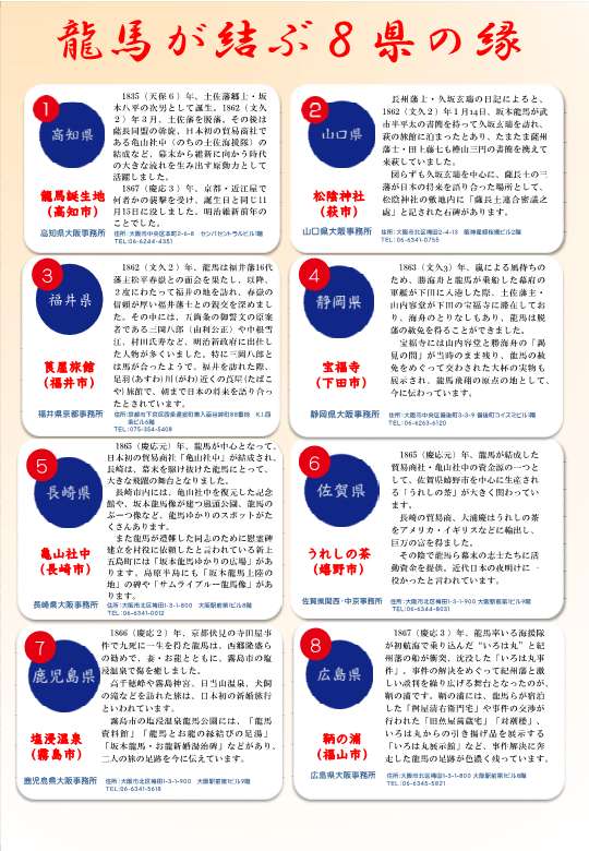 幕末の英雄・坂本龍馬ゆかりの8県(高知県、山口県、福井県、静岡県、長崎県、佐賀県、鹿児島県、広島県)が、龍馬をはじめ幕末の志士たちが活躍した京都の地で幕末維新期の各地のつながりを、PRするイベントが11月15日(土)に開催されます。