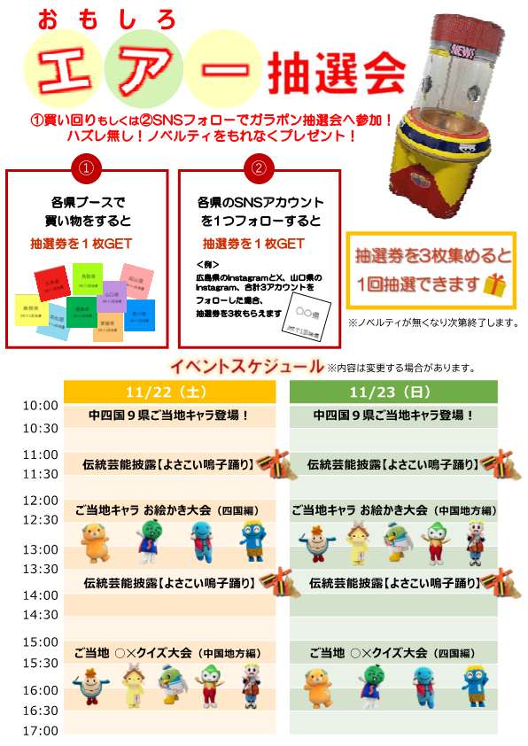 中四国9県のご当地キャラが登場し、お絵かき大会やクイズ大会を行います。